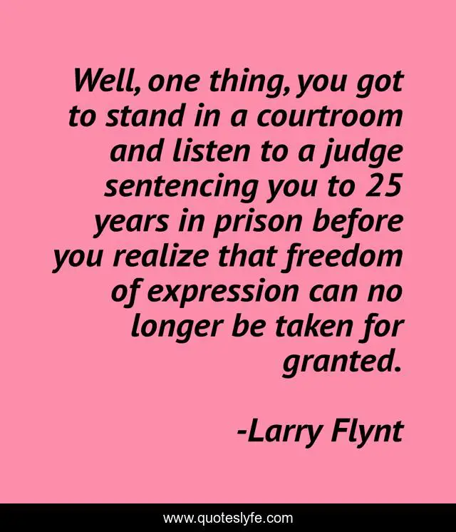 This page presents the quote "Well, one thing, you got to stand in a courtroom and listen to a judge sentencing you to 25 years in prison before you realize that freedom of expression can no longer be taken for granted.". Author of this quote is Larry Flynt. This quote is about stand, prison,.