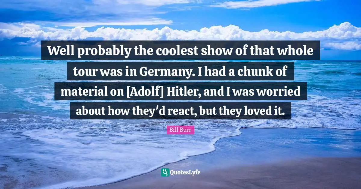 This page presents the quote "Well probably the coolest show of that whole tour was in Germany. I had a chunk of material on [Adolf] Hitler, and I was worried about how they'd react, but they loved it.". Author of this quote is Bill Burr. This quote is about shows, germany, whole, worried,.