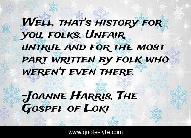This page presents the quote "Well, that's history for you, folks. Unfair, untrue and for the most part written by folk who weren't even there.". Author of this quote is Joanne Harris, The Gospel of Loki. This quote is about the-gospel-of-loki, loki, history, mythology, norse-mythology,.