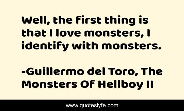 This page presents the quote "Well, the first thing is that I love monsters, I identify with monsters.". Author of this quote is Guillermo del Toro, The Monsters Of Hellboy II. This quote is about j-h-everett, del-toro, hellboy, monsters,.