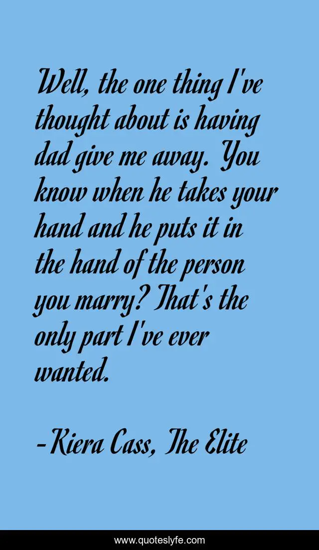This page presents the quote "Well, the one thing I've thought about is having dad give me away. You know when he takes your hand and he puts it in the hand of the person you marry? That's the only part I've ever wanted.". Author of this quote is Kiera Cass, The Elite. .