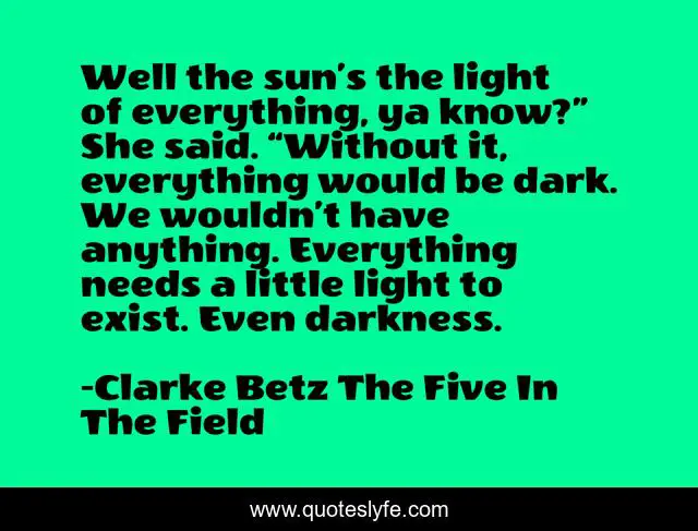 This page presents the quote "Well the sun’s the light of everything, ya know?” She said. “Without it, everything would be dark. We wouldn’t have anything. Everything needs a little light to exist. Even darkness.". Author of this quote is Clarke Betz The Five In The Field. This quote is about dark, existence, light, darkness, sun,.