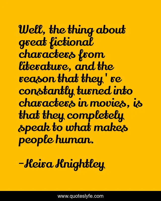This page presents the quote "Well, the thing about great fictional characters from literature, and the reason that they're constantly turned into characters in movies, is that they completely speak to what makes people human.". Author of this quote is Keira Knightley. This quote is about great, speak, people,.