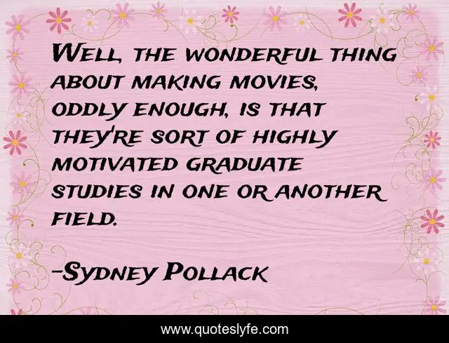 This page presents the quote "Well, the wonderful thing about making movies, oddly enough, is that they're sort of highly motivated graduate studies in one or another field.". Author of this quote is Sydney Pollack. This quote is about well, wonderful, motivated,.