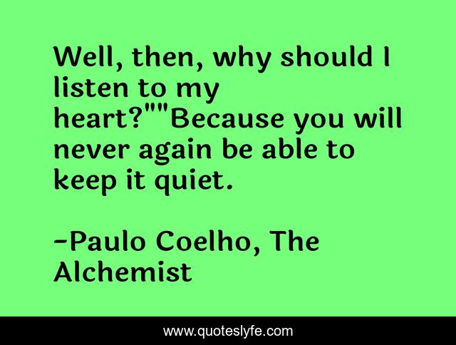 This page presents the quote "Well, then, why should I listen to my heart?""Because you will never again be able to keep it quiet.". Author of this quote is Paulo Coelho, The Alchemist. This quote is about inspirational-attitude, faith-in-yourself, the-alchemist,.