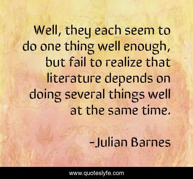 This page presents the quote "Well, they each seem to do one thing well enough, but fail to realize that literature depends on doing several things well at the same time.". Author of this quote is Julian Barnes. This quote is about literature, creativity, writers, writing,.