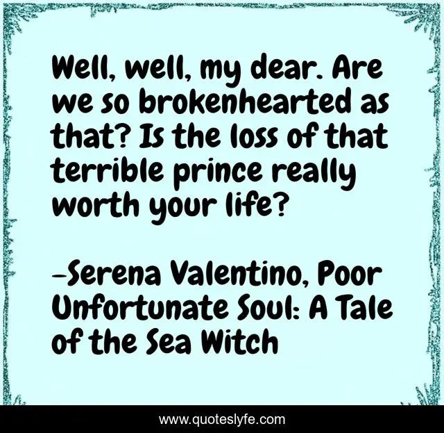 This page presents the quote "Well, well, my dear. Are we so brokenhearted as that? Is the loss of that terrible prince really worth your life?". Author of this quote is Serena Valentino, Poor Unfortunate Soul: A Tale of the Sea Witch. This quote is about broken-heart, grief, suicide,.