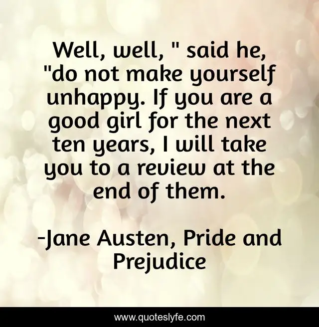 This page presents the quote "Well, well, " said he, "do not make yourself unhappy. If you are a good girl for the next ten years, I will take you to a review at the end of them.". Author of this quote is Jane Austen, Pride and Prejudice. This quote is about wit, humour,.
