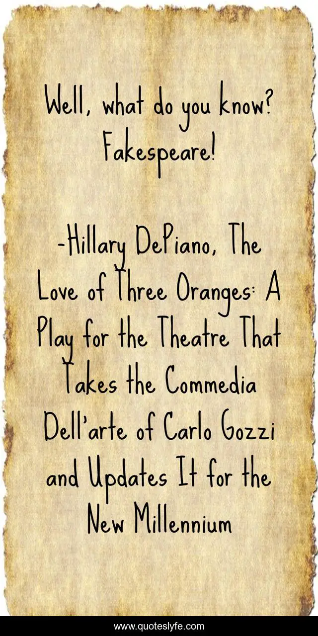 This page presents the quote "Well, what do you know? Fakespeare!". Author of this quote is Hillary DePiano, The Love of Three Oranges: A Play for the Theatre That Takes the Commedia Dell'arte of Carlo Gozzi and Updates It for the New Millennium. This quote is about the-love-of-three-oranges, commedia, comedy, shakespeare, parody,.