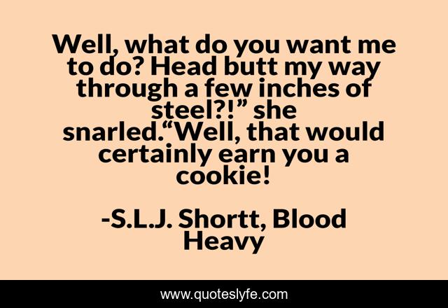 This page presents the quote "Well, what do you want me to do? Head butt my way through a few inches of steel?!” she snarled.“Well, that would certainly earn you a cookie!". Author of this quote is S.L.J. Shortt, Blood Heavy. This quote is about sarcasm, humor,.