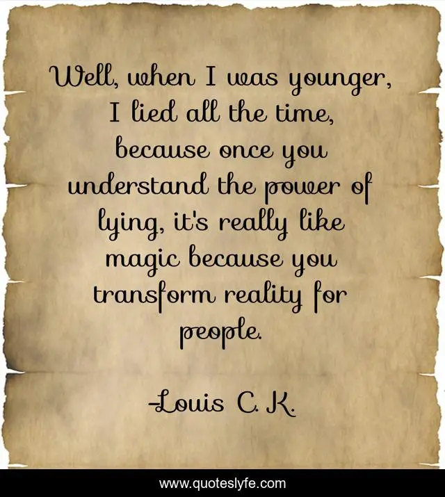 This page presents the quote "Well, when I was younger, I lied all the time, because once you understand the power of lying, it's really like magic because you transform reality for people.". Author of this quote is Louis C. K.. This quote is about people, time, reality,.