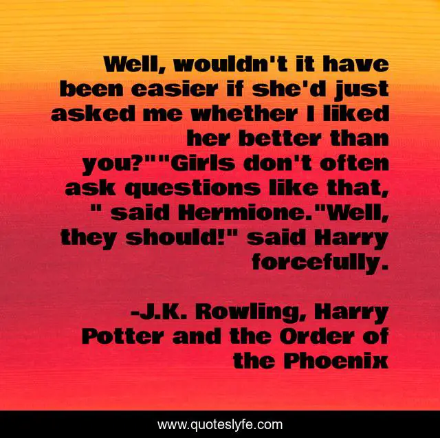 This page presents the quote "Well, wouldn't it have been easier if she'd just asked me whether I liked her better than you?""Girls don't often ask questions like that, " said Hermione."Well, they should!" said Harry forcefully.". Author of this quote is J.K. Rowling, Harry Potter and the Order of the Phoenix. .