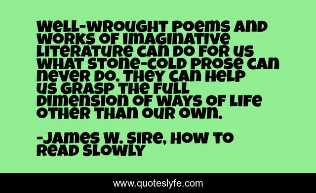 This page presents the quote "Well-wrought poems and works of imaginative literature can do for us what stone-cold prose can never do. They can help us grasp the full dimension of ways of life other than our own.". Author of this quote is James W. Sire, How to Read Slowly. This quote is about books, poetry, literature, reading,.
