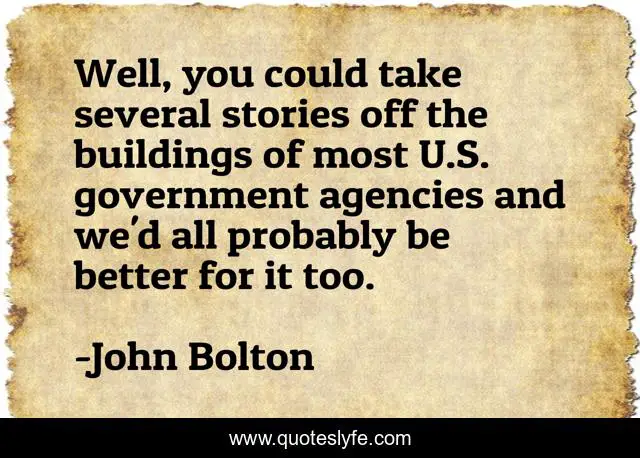 This page presents the quote "Well, you could take several stories off the buildings of most U.S. government agencies and we'd all probably be better for it too.". Author of this quote is John Bolton. This quote is about better, buildings,.