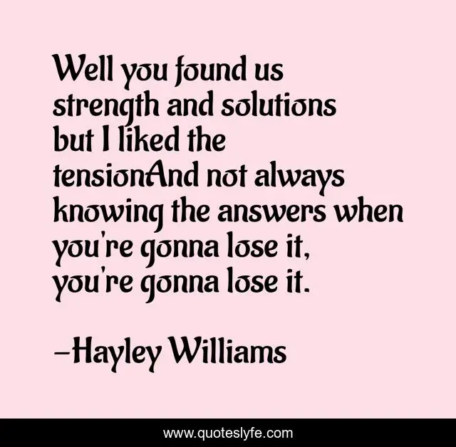 This page presents the quote "Well you found us strength and solutions but I liked the tensionAnd not always knowing the answers when you're gonna lose it, you're gonna lose it.". Author of this quote is Hayley Williams. This quote is about hayley-williams, music, monster, lyrics,.