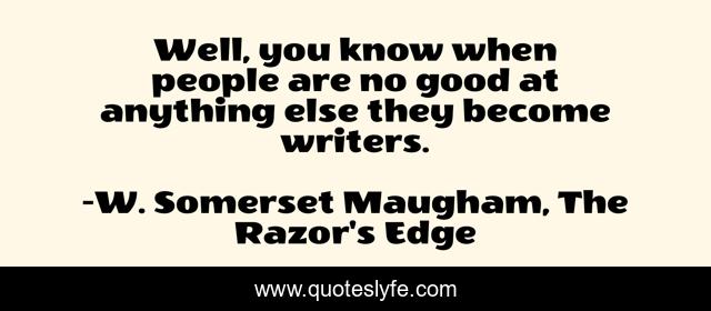 This page presents the quote "Well, you know when people are no good at anything else they become writers.". Author of this quote is W. Somerset Maugham, The Razor's Edge. .