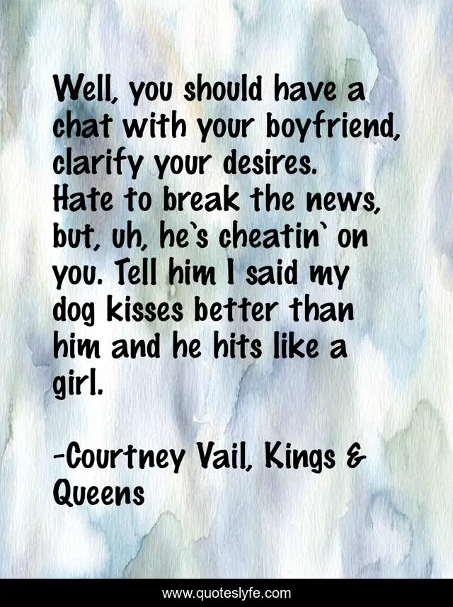 This page presents the quote "Well, you should have a chat with your boyfriend, clarify your desires. Hate to break the news, but, uh, he’s cheatin’ on you. Tell him I said my dog kisses better than him and he hits like a girl.". Author of this quote is Courtney Vail, Kings & Queens. This quote is about ya, mystery-suspense, suspense-thriller,.