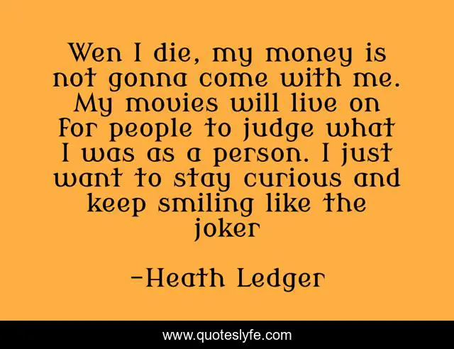 This page presents the quote "Wen I die, my money is not gonna come with me. My movies will live on for people to judge what I was as a person. I just want to stay curious and keep smiling like the joker". Author of this quote is Heath Ledger. This quote is about enthusiasm, truth-of-life, keep-smiling, inspirational,.