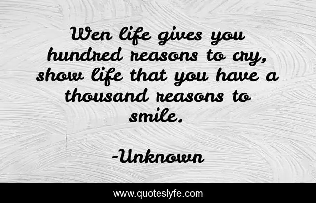 This page presents the quote "Wen life gives you hundred reasons to cry, show life that you have a thousand reasons to smile.". Author of this quote is Unknown. This quote is about enthusiasm, life, crying, sadness, inspirational,.