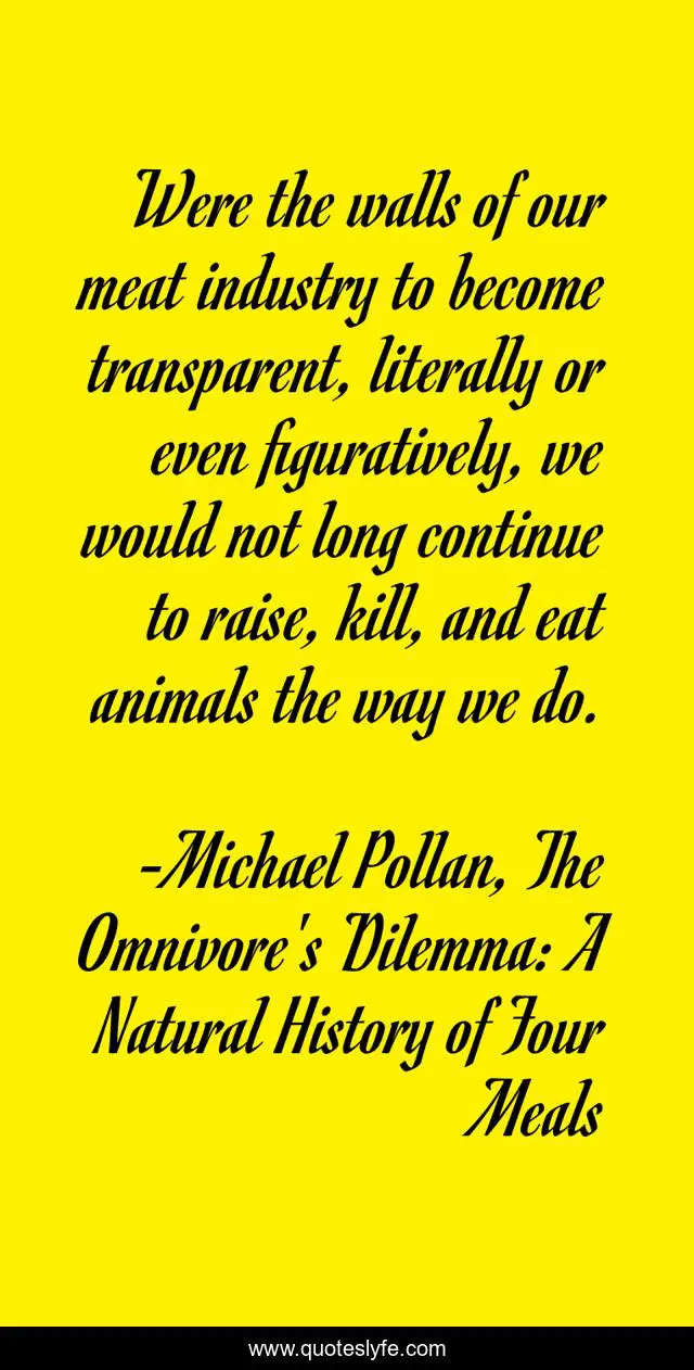 "Michael Pollan, The Omnivore's Dilemma: A Natural History of Four Meals Quotes." Quoteslyfe.com, 2025. Tue. 09 Dec. 2025. <https://www.quoteslyfe.com/quote/Were-the-walls-of-our-meat-industry-205402>.