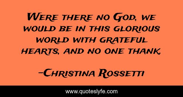 This page presents the quote "Were there no God, we would be in this glorious world with grateful hearts, and no one thank.". Author of this quote is Christina Rossetti. This quote is about gratitude, god, thankfulness,.