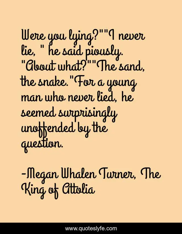 This page presents the quote "Were you lying?""I never lie, " he said piously. "About what?""The sand, the snake."For a young man who never lied, he seemed surprisingly unoffended by the question.". Author of this quote is Megan Whalen Turner, The King of Attolia. This quote is about eugenides, lying,.