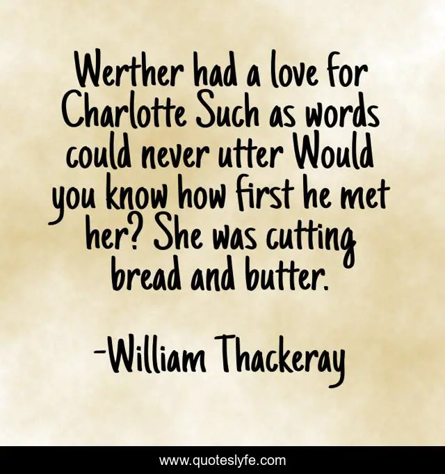 This page presents the quote "Werther had a love for Charlotte Such as words could never utter Would you know how first he met her? She was cutting bread and butter.". Author of this quote is William Thackeray. This quote is about love, affection,.
