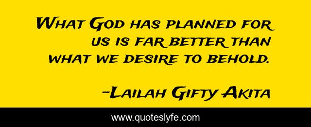 This page presents the quote "What God has planned for us is far better than what we desire to behold.". Author of this quote is Lailah Gifty Akita. This quote is about faith, confidence, desires, god-s-plan, positive, motivational, purpose, hope, optimistic,.