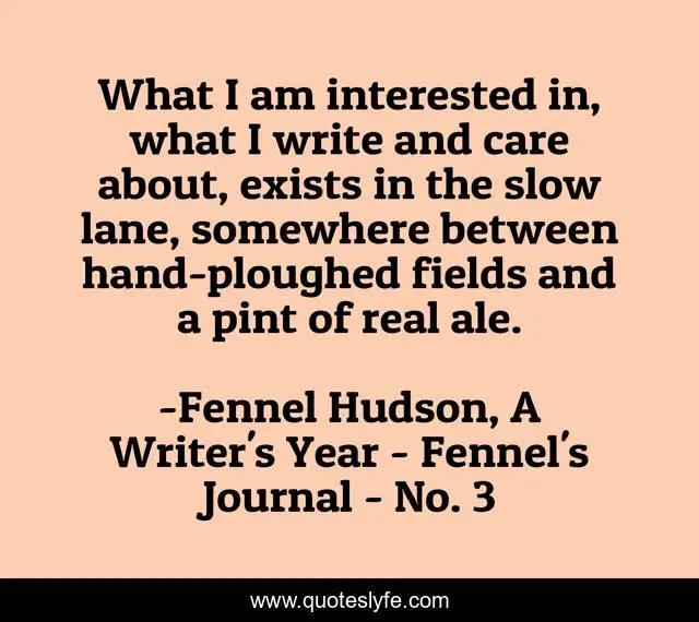 This page presents the quote "What I am interested in, what I write and care about, exists in the slow lane, somewhere between hand-ploughed fields and a pint of real ale.". Author of this quote is Fennel Hudson, A Writer's Year - Fennel's Journal - No. 3. This quote is about writer, slow-pace-of-life, writing, passion, interest, care,.
