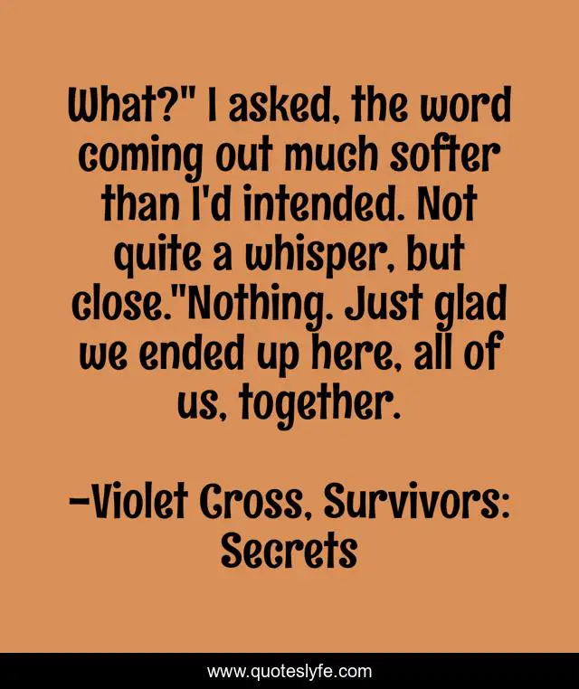 This page presents the quote "What?" I asked, the word coming out much softer than I'd intended. Not quite a whisper, but close."Nothing. Just glad we ended up here, all of us, together.". Author of this quote is Violet Cross, Survivors: Secrets. This quote is about secrets, survivors,.