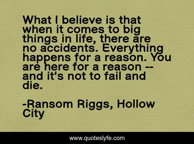 This page presents the quote "What I believe is that when it comes to big things in life, there are no accidents. Everything happens for a reason. You are here for a reason -- and it's not to fail and die.". Author of this quote is Ransom Riggs, Hollow City. This quote is about choices, destiny, belief,.