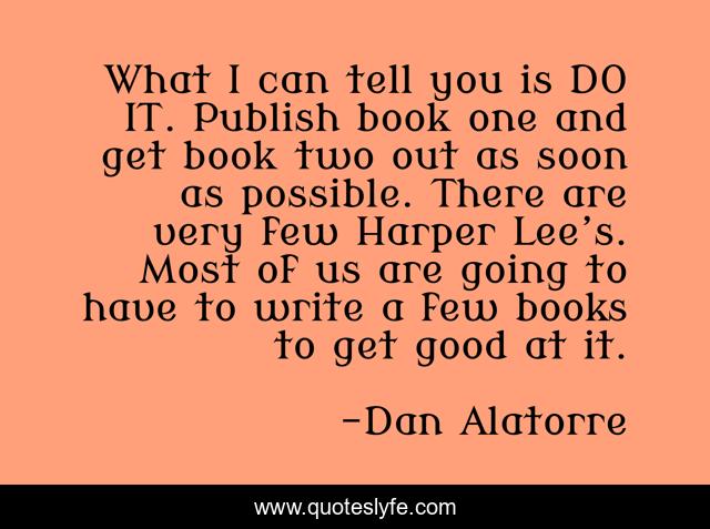 This page presents the quote "What I can tell you is DO IT. Publish book one and get book two out as soon as possible. There are very few Harper Lee’s. Most of us are going to have to write a few books to get good at it.". Author of this quote is Dan Alatorre. .