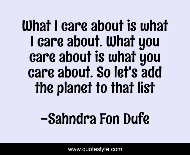 This page presents the quote "What I care about is what I care about. What you care about is what you care about. So let's add the planet to that list". Author of this quote is Sahndra Fon Dufe. This quote is about earth, food-for-thought, author-sahndra-fon-dufe,.