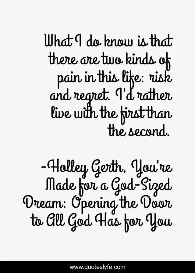 This page presents the quote "What I do know is that there are two kinds of pain in this life: risk and regret. I'd rather live with the first than the second.". Author of this quote is Holley Gerth, You're Made for a God-Sized Dream: Opening the Door to All God Has for You. This quote is about pain, regret, risk,.