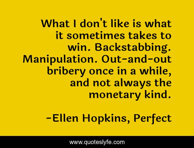 This page presents the quote "What I don't like is what it sometimes takes to win. Backstabbing. Manipulation. Out-and-out bribery once in a while, and not always the monetary kind.". Author of this quote is Ellen Hopkins, Perfect. This quote is about winning-and-losing, winning,.