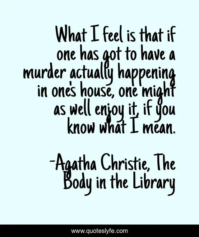 This page presents the quote "What I feel is that if one has got to have a murder actually happening in one's house, one might as well enjoy it, if you know what I mean.". Author of this quote is Agatha Christie, The Body in the Library. .