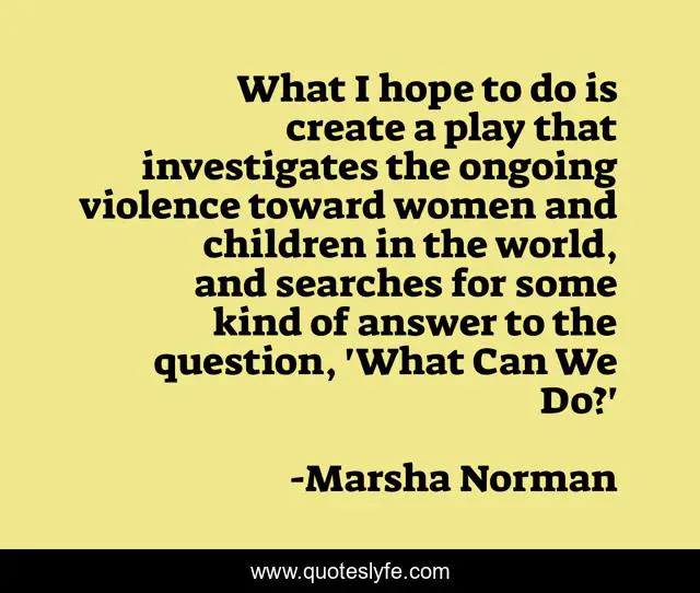 This page presents the quote "What I hope to do is create a play that investigates the ongoing violence toward women and children in the world, and searches for some kind of answer to the question, 'What Can We Do?'". Author of this quote is Marsha Norman. This quote is about violence, children, women,.