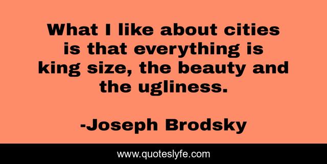 This page presents the quote "What I like about cities is that everything is king size, the beauty and the ugliness.". Author of this quote is Joseph Brodsky. This quote is about king, size, everything,.
