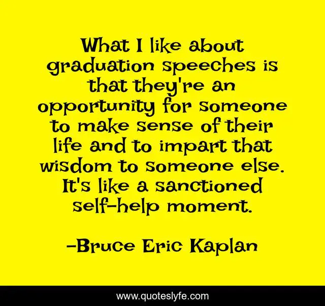 This page presents the quote "What I like about graduation speeches is that they're an opportunity for someone to make sense of their life and to impart that wisdom to someone else. It's like a sanctioned self-help moment.". Author of this quote is Bruce Eric Kaplan. This quote is about life, opportunity, wisdom,.