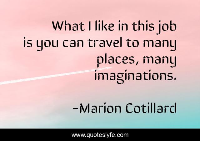 This page presents the quote "What I like in this job is you can travel to many places, many imaginations.". Author of this quote is Marion Cotillard. This quote is about job, places,.