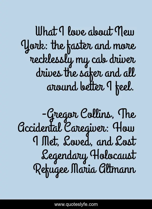 This page presents the quote "What I love about New York: the faster and more recklessly my cab driver drives the safer and all around better I feel.". Author of this quote is Gregor Collins, The Accidental Caregiver: How I Met, Loved, and Lost Legendary Holocaust Refugee Maria Altmann. .