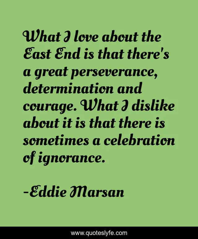 This page presents the quote "What I love about the East End is that there's a great perseverance, determination and courage. What I dislike about it is that there is sometimes a celebration of ignorance.". Author of this quote is Eddie Marsan. This quote is about perseverance, great, love, affection,.