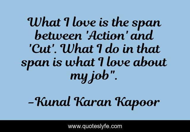 This page presents the quote "What I love is the span between 'Action' and 'Cut'. What I do in that span is what I love about my job".". Author of this quote is Kunal Karan Kapoor. This quote is about action, enthusiasm, talent, actor, inspirational,.