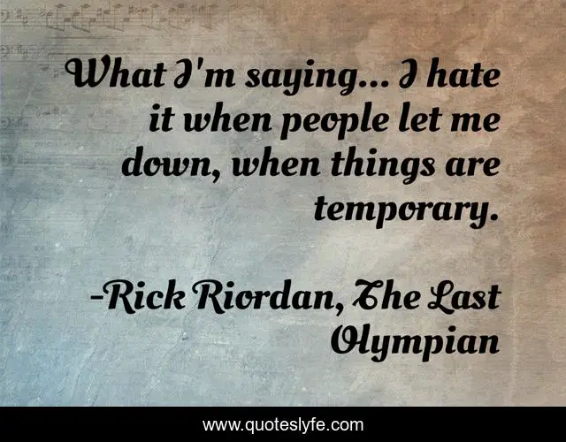 This page presents the quote "What I'm saying... I hate it when people let me down, when things are temporary.". Author of this quote is Rick Riordan, The Last Olympian. This quote is about friendship, annabeth-chase,.