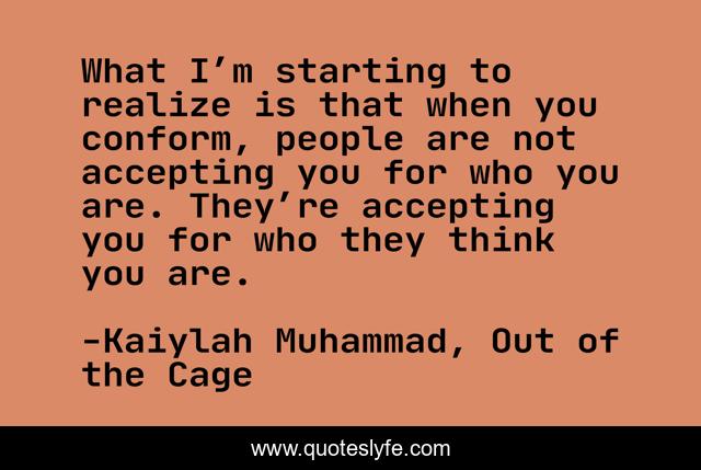 This page presents the quote "What I’m starting to realize is that when you conform, people are not accepting you for who you are. They’re accepting you for who they think you are.". Author of this quote is Kaiylah Muhammad, Out of the Cage. This quote is about enthusiasm, acceptance, conformity, self-improvement, inspirational,.