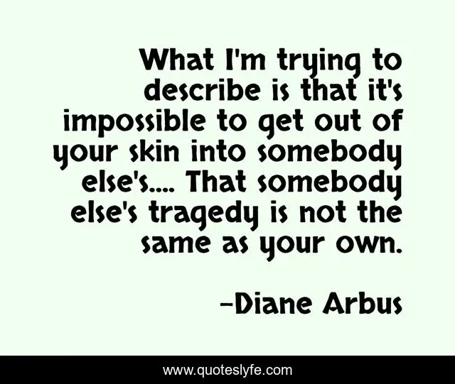 This page presents the quote "What I'm trying to describe is that it's impossible to get out of your skin into somebody else's.... That somebody else's tragedy is not the same as your own.". Author of this quote is Diane Arbus. This quote is about photographs, photography, art,.