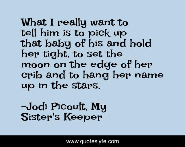 This page presents the quote "What I really want to tell him is to pick up that baby of his and hold her tight, to set the moon on the edge of her crib and to hang her name up in the stars.". Author of this quote is Jodi Picoult, My Sister's Keeper. This quote is about fathers, daughters, stars, moon,.