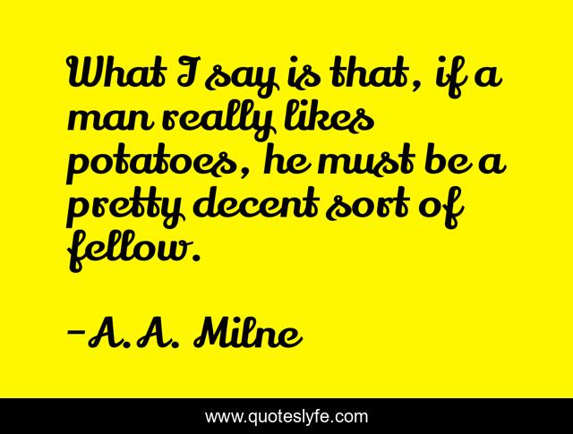 This page presents the quote "What I say is that, if a man really likes potatoes, he must be a pretty decent sort of fellow.". Author of this quote is A.A. Milne. This quote is about food, potatoes, character,.