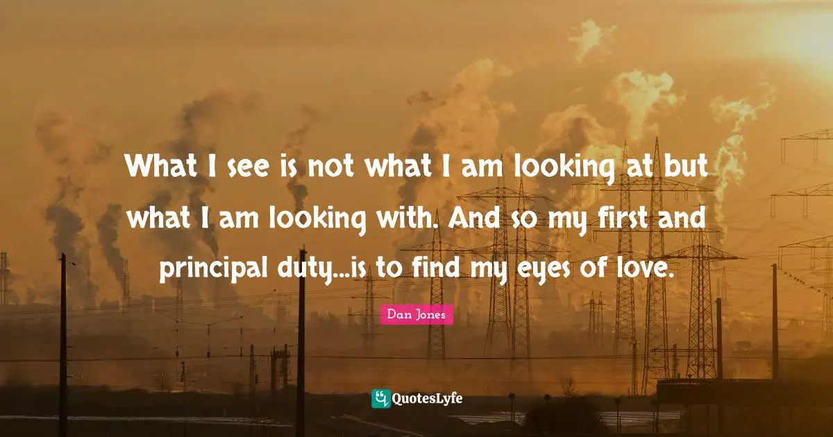 This page presents the quote "What I see is not what I am looking at but what I am looking with. And so my first and principal duty...is to find my eyes of love.". Author of this quote is Dan Jones. This quote is about firsts, principal, eye, eyes of love, duty,.