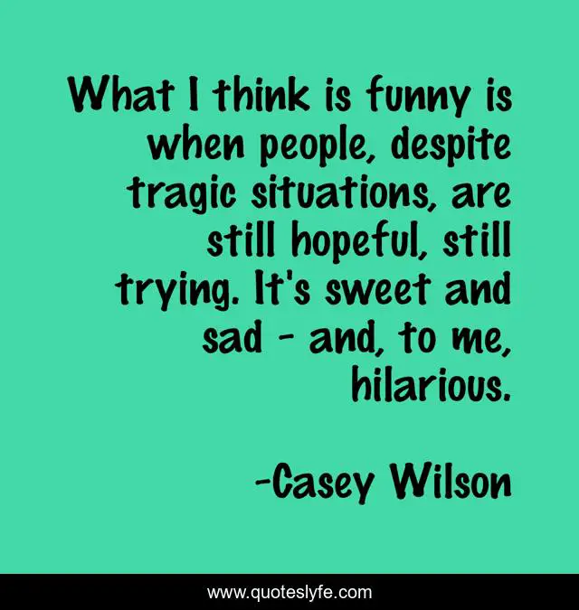 This page presents the quote "What I think is funny is when people, despite tragic situations, are still hopeful, still trying. It's sweet and sad - and, to me, hilarious.". Author of this quote is Casey Wilson. This quote is about me, funny, comedy, sweet,.